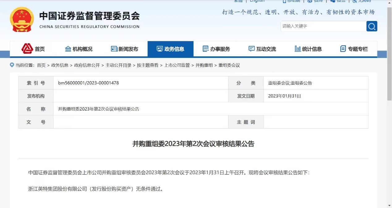 2023年1月31日,公司黨委書記、董事長應徐頡帶領公司董事會秘書譚江、財務負責人金小波以及獨立財務顧問財通證券等中介機構組成的答辯團隊,向中國證監會并購重組審核委員會就公司重大資產重組事項進行了匯報和問題答辯,經其審核,我司重大資產重組項目獲得無條件通過。