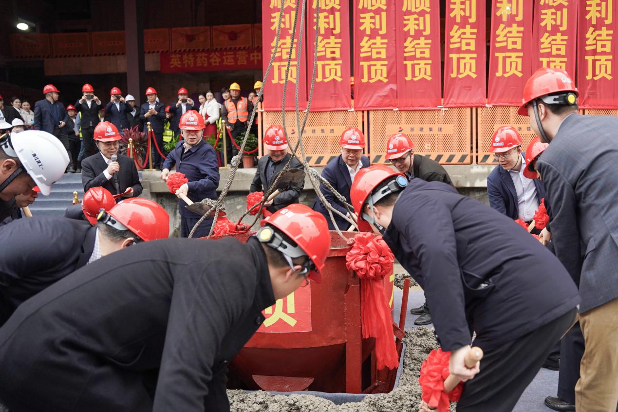 結頂儀式上,出席儀式的嘉賓們揮動金鏟,在禮炮奏鳴聲中,共同將封頂金土送入大鼎之中。隨著大鼎升懸,英特集團黨委書記、董事長應徐頡宣布:“英特集團英特藥谷運營中心項目喜結金頂!”